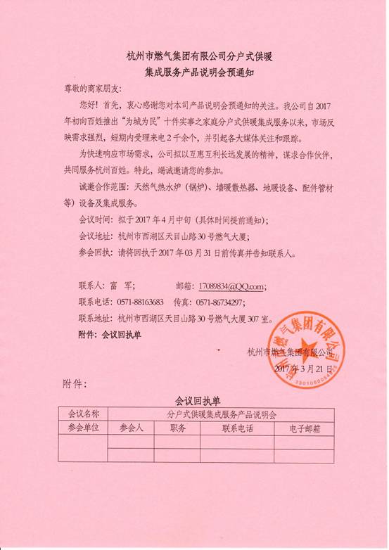 杭州市燃氣集團有限公司分戶式供暖集成服務產品說明會預通知