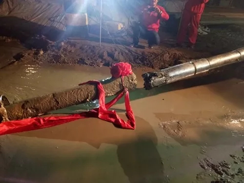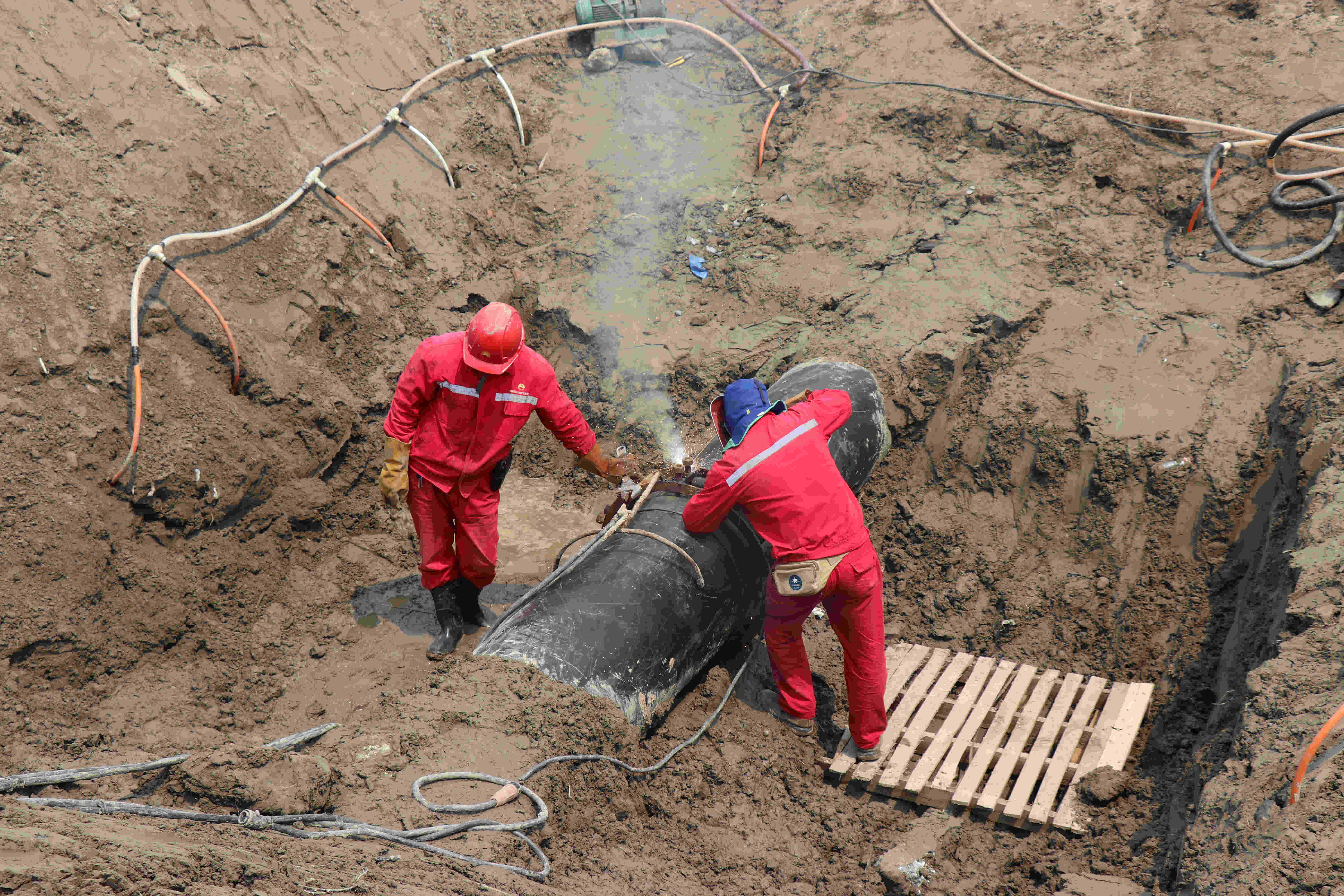 圖1:2018年4月26日上午,杭州天然氣高壓東段跨江工程實施“最后一處連接碰接”,后續將實施氮氣置換以及天然氣通氣工作。