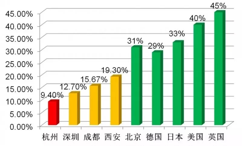 圖7:十二五末,杭州市天然氣消費占一次能源消費中的占比與部分國內城市及發達國家的比較。