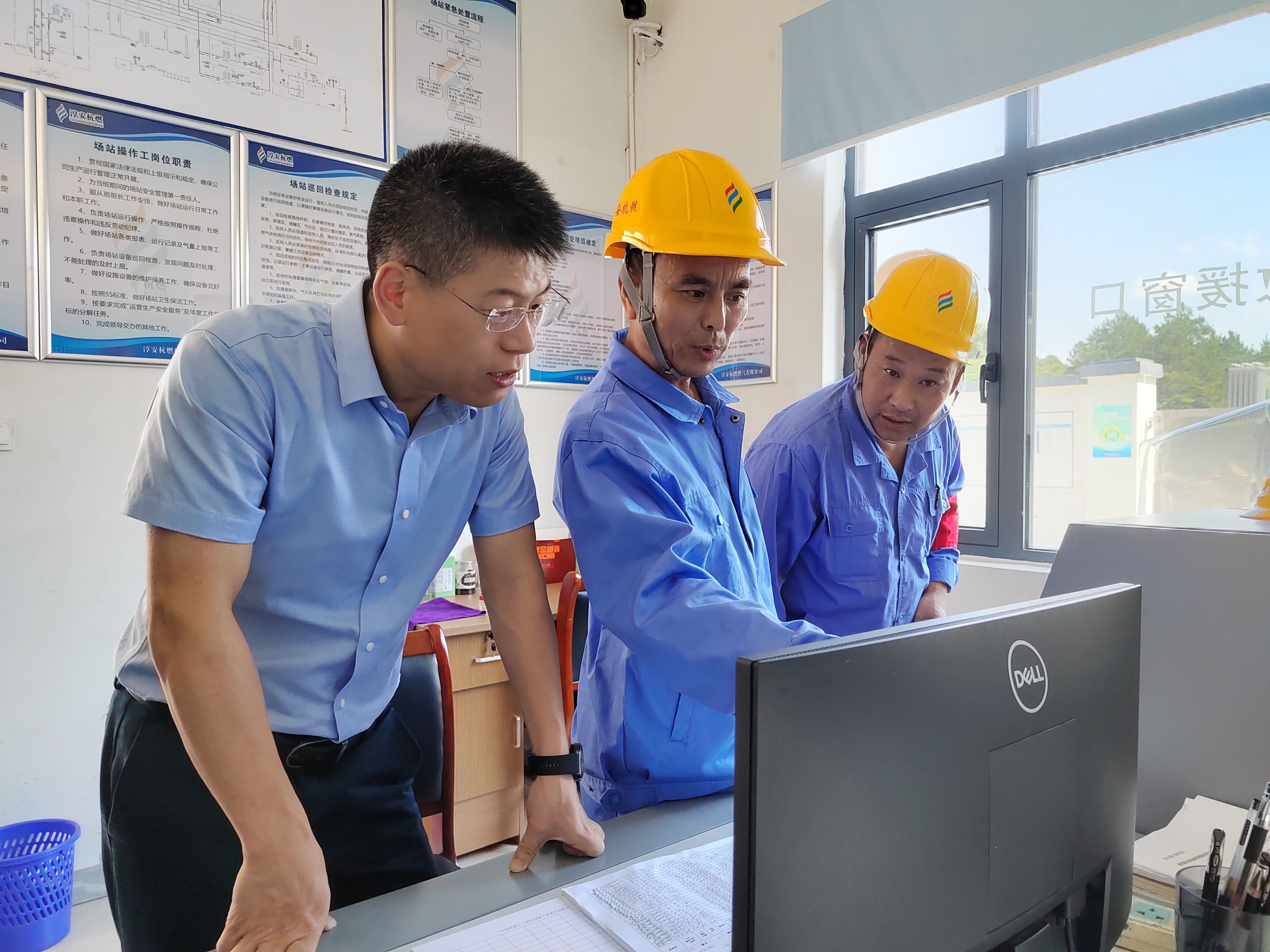 萬董一行首先實地調研參觀了淳安公司企業文化墻、杭燃優家體驗中心、員工辦公環境,隨后檢查了豐家山氣化站、界首亞運氣化站和淳安公司調度室,詳細了解了各場站運營情況,并親切慰問了在崗一線員工,為他們送上了防暑降溫用品,叮囑大家做好防暑工作,確保場站安全運營。