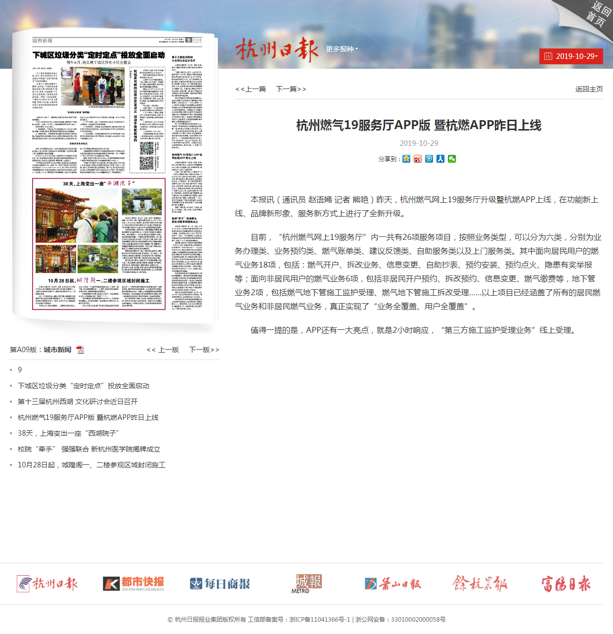 本報訊(通訊員 趙語嫣 記者 熊艷)昨天,杭州燃氣網上19服務廳升級曁杭燃APP上線,在功能新上線、品牌新形象、服務新方式上進行了全新升級。