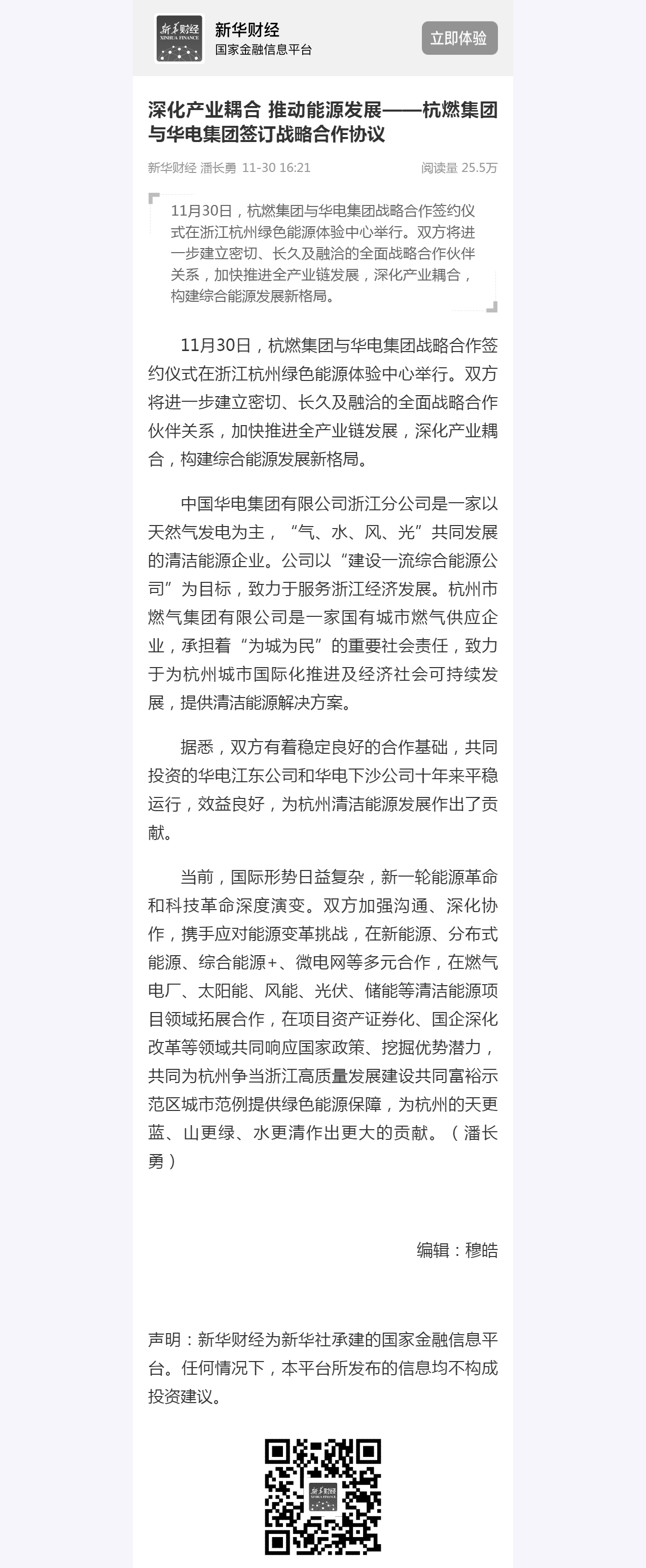 11月30日,杭燃集團與華電集團戰(zhàn)略合作簽約儀式在浙江杭州綠色能源體驗中心舉行。雙方將進一步建立密切、長久及融洽的全面戰(zhàn)略合作伙伴關(guān)系,加快推進全產(chǎn)業(yè)鏈發(fā)展,深化產(chǎn)業(yè)耦合,構(gòu)建綜合能源發(fā)展新格局。