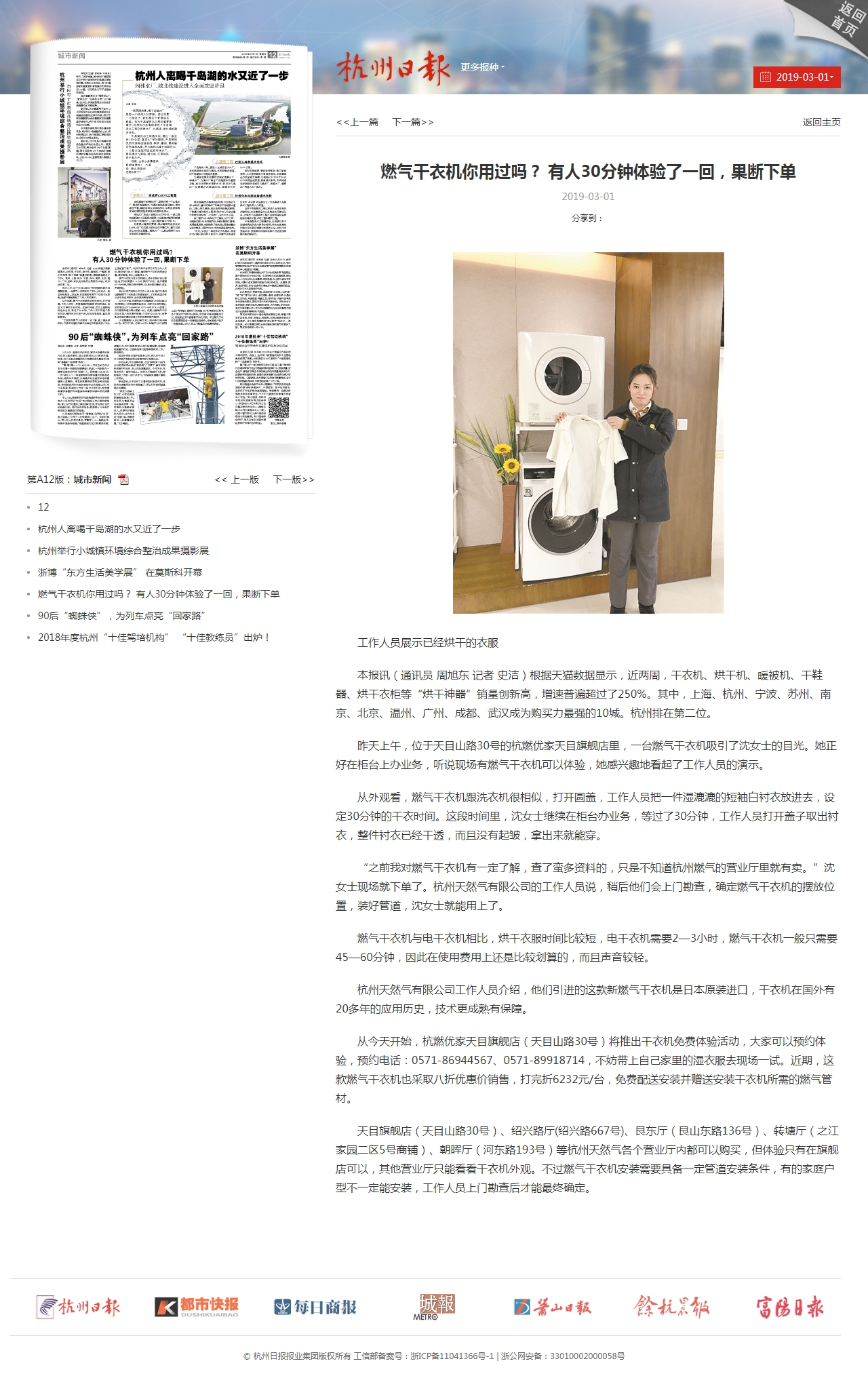 “之前我對燃氣干衣機有一定了解,查了蠻多資料的,只是不知道杭州燃氣的營業廳里就有賣。”沈女士現場就下單了。杭州天然氣有限公司的工作人員說,稍后他們會上門勘查,確定燃氣干衣機的擺放位置,裝好管道,沈女士就能用上了。