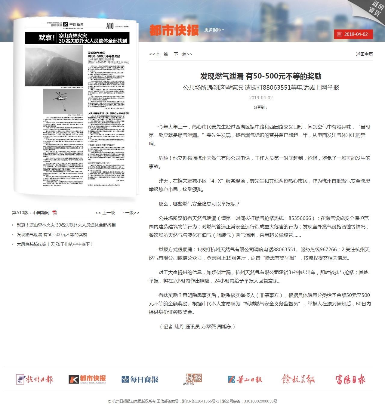 危險!他立刻撥通杭州天然氣有限公司電話,工作人員第一時間趕到,搶修,避免了一場可能發(fā)生的事故。
