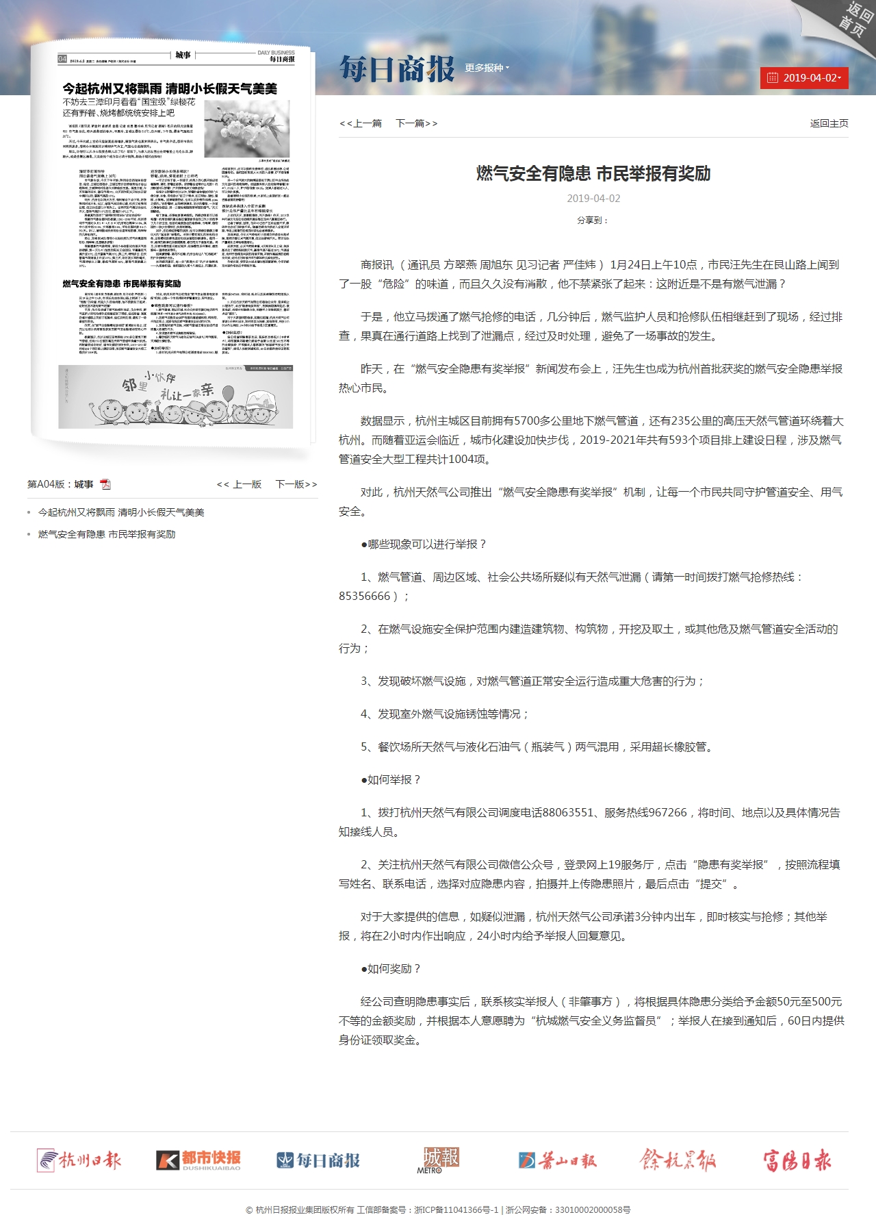 經公司查明隱患事實后,聯系核實舉報人(非肇事方),將根據具體隱患分類給予金額50元至500元不等的金額獎勵,并根據本人意愿聘為“杭城燃氣安全義務監督員”;舉報人在接到通知后,60日內提供身份證領取獎金。